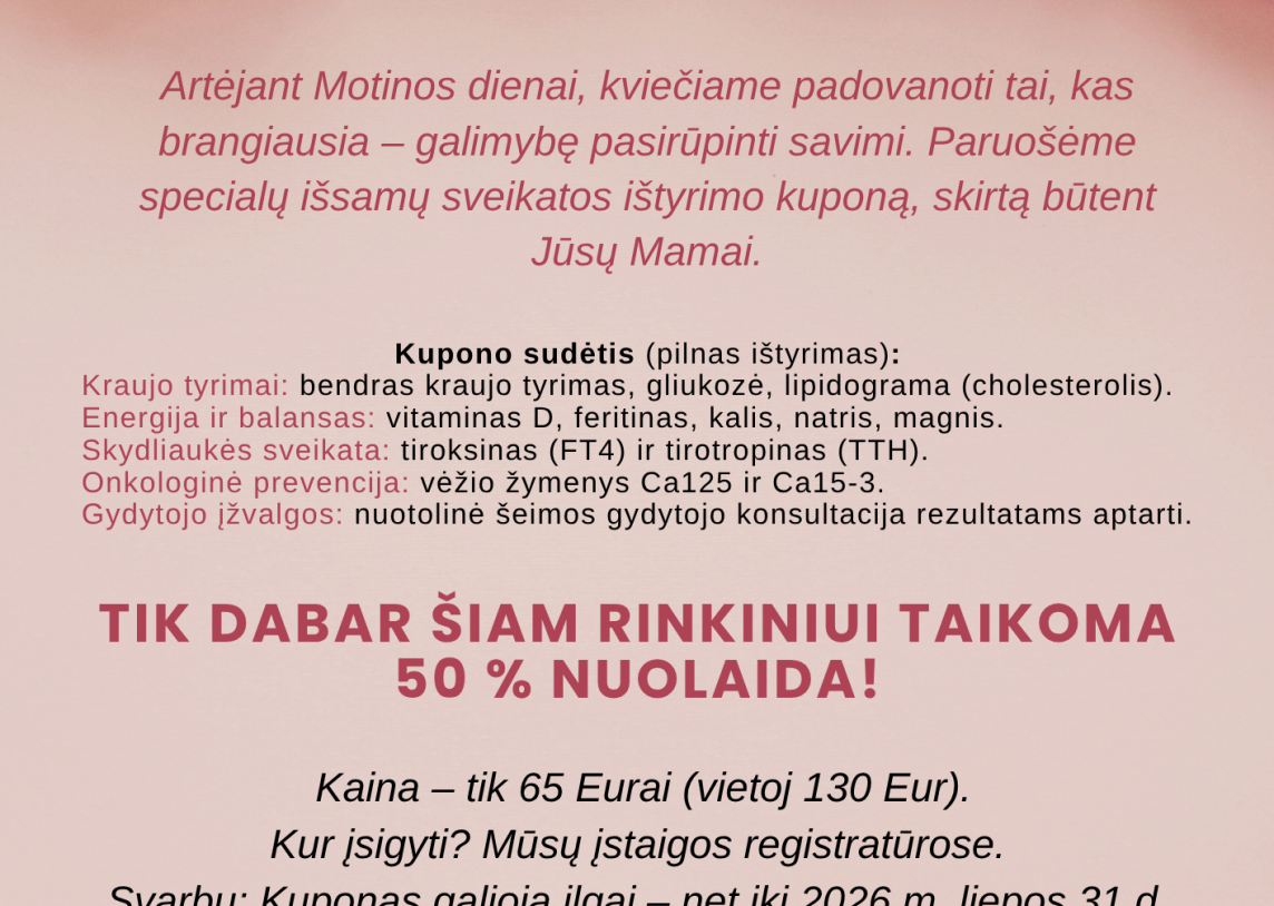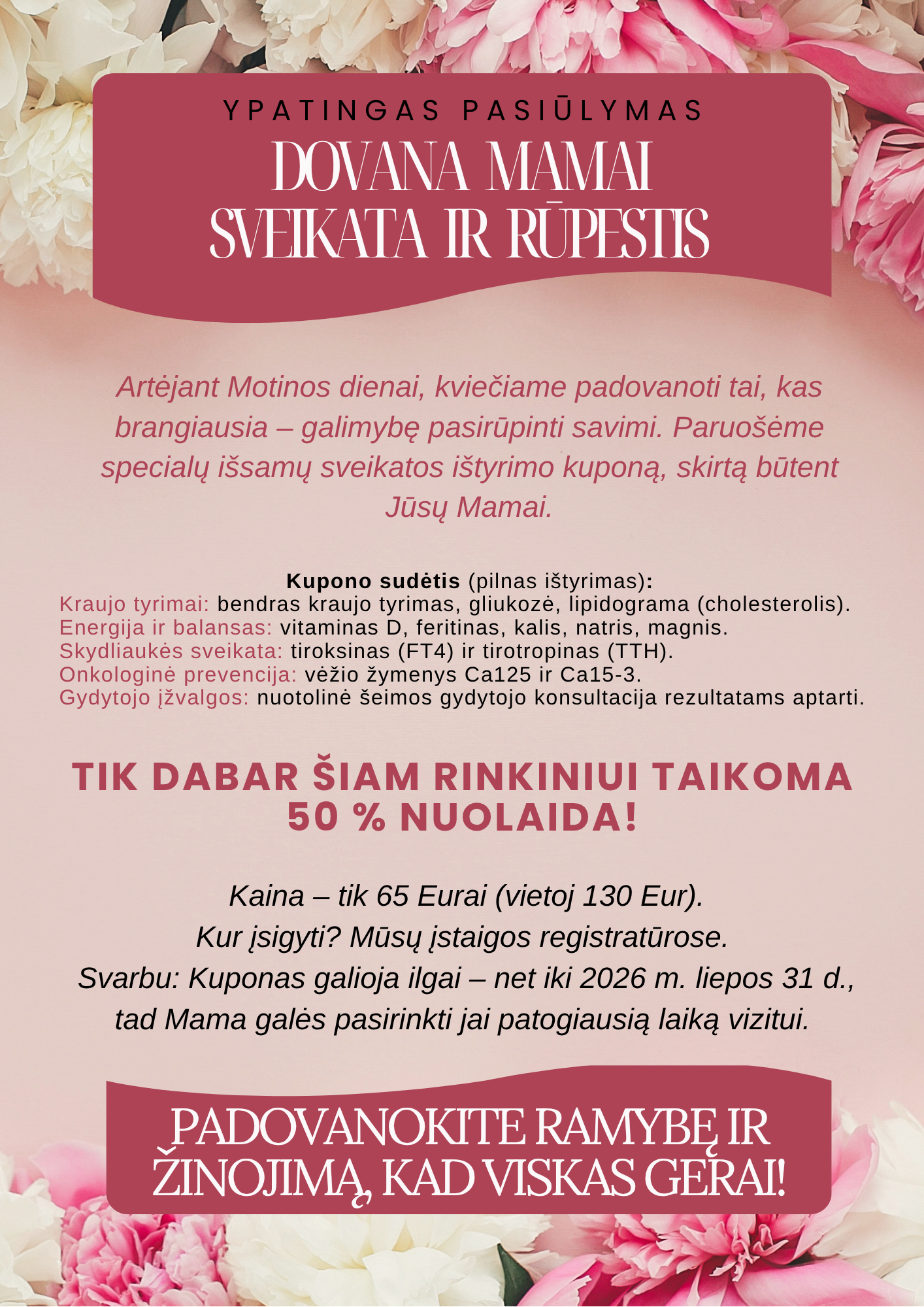 Kviečiame VšĮ Kretingos pirminės sveikatos priežiūros centro pacientus pasinaudoti proga ir padovanoti brangiausiam žmogui Mamai galimybę pasitikrinti sveikatą.